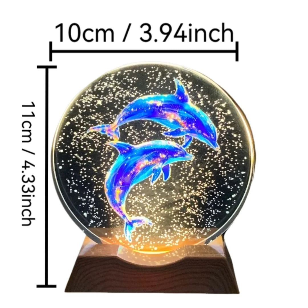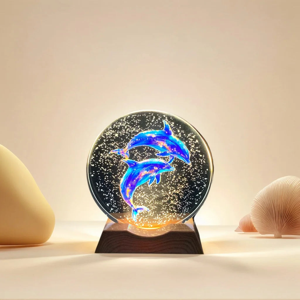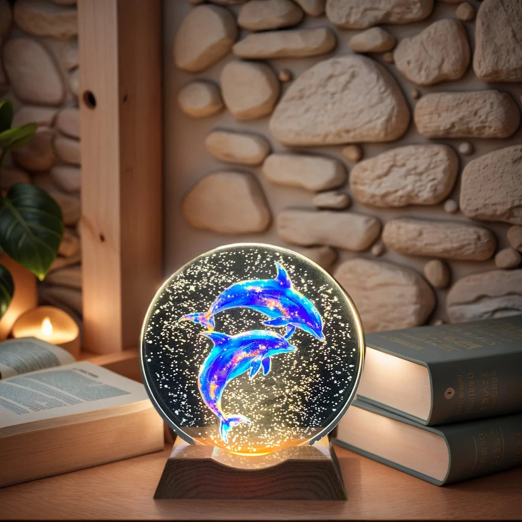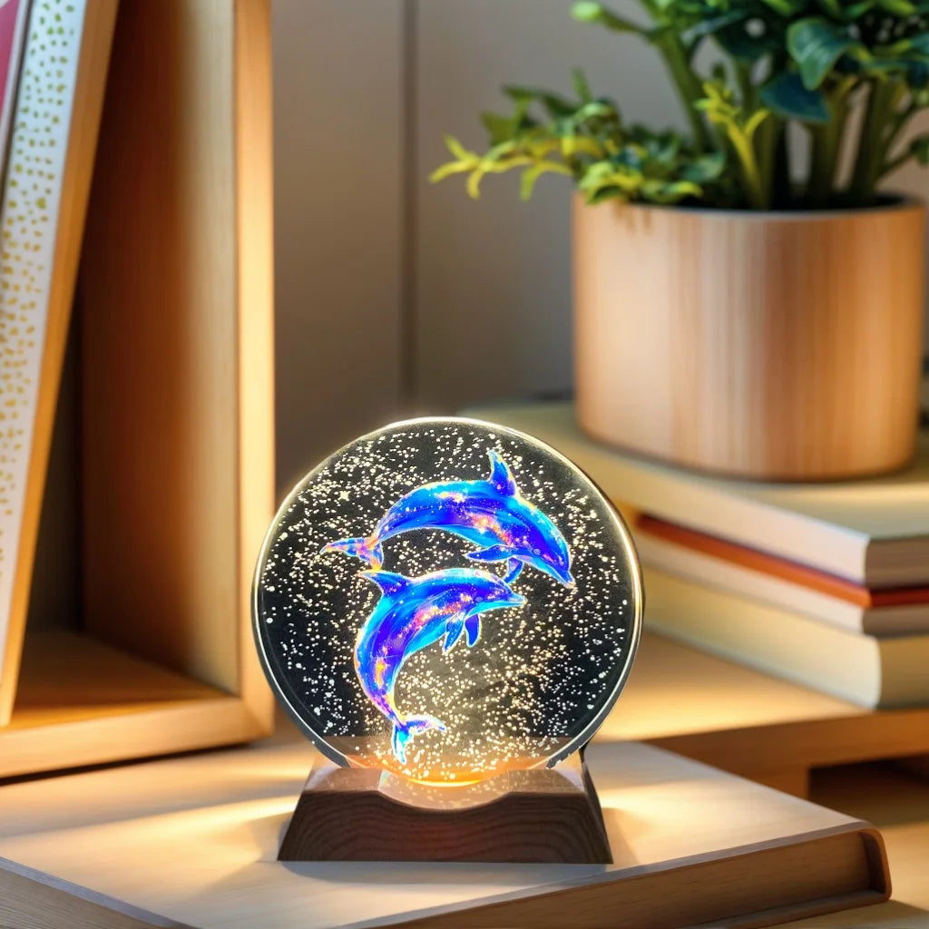 Luz nocturna de cristal con delfines grabados en 3D y base LED. Diseño romántico, luz suave. Regalo perfecto para parejas o amantes del mar.